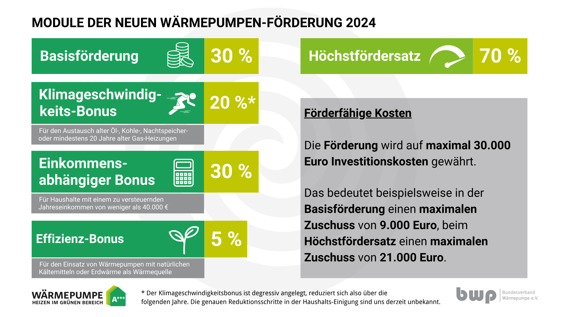 Según la nueva ley de calefacción del 1 de enero de 2024, el importe máximo de inversión que se puede financiar es, lamentablemente, de sólo 30.000 € en lugar de 60.000 €. Es decir. El 50% (financiación básica 30% + bonificación velocidad 20%) de 30.000€ son 15.000€ que te he descontado aquí.